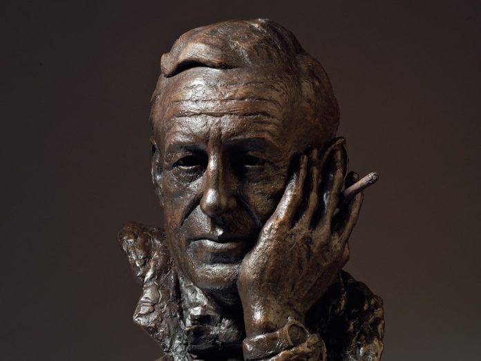 Bronze bust of the author Ian Fleming by the British sculptor Anthony Smith. Commissioned by the Fleming family to commemorate the centenary of Ian Fleming’s birth in 2008. Photo: Fortheloveofknowledge / CC BY-SA 4.0 DEED. Cropped.